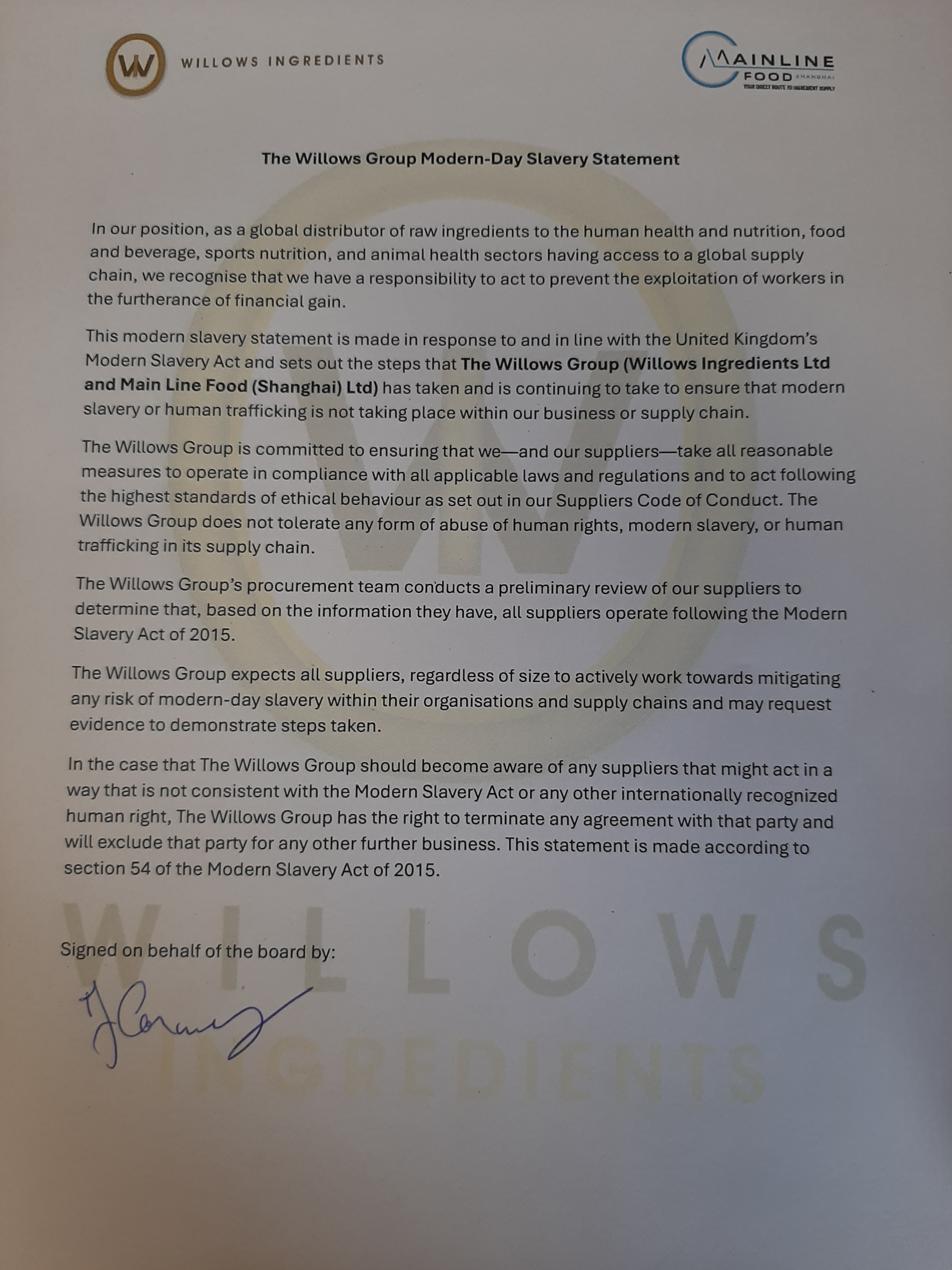 Modern slavery and human trafficking often remain hidden in plain sight in our global societies. We all have a responsibility to be alert to the risks, however small, in our business and the wider supply chain, and we are committed to ensuring that modern day slavery or human trafficking is not taking place within our business or supply chain.